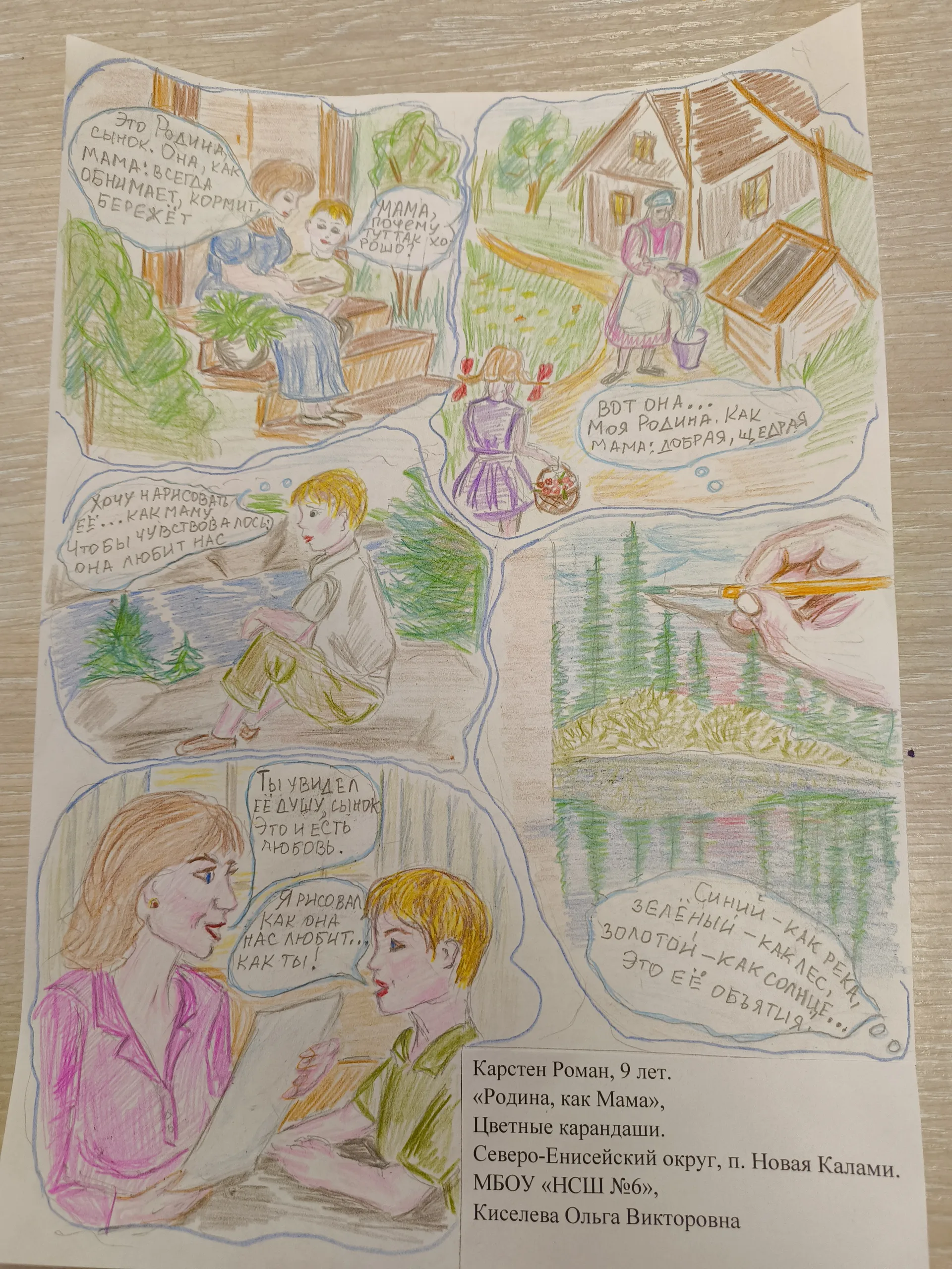 - Карстен Роман МБОУ «Новокаламинская средняя школа №6», в номинации «Комикс», возрастная группа 10-13 лет, работа «Родина, как мама» (руководитель Киселева Ольга Викторовна).